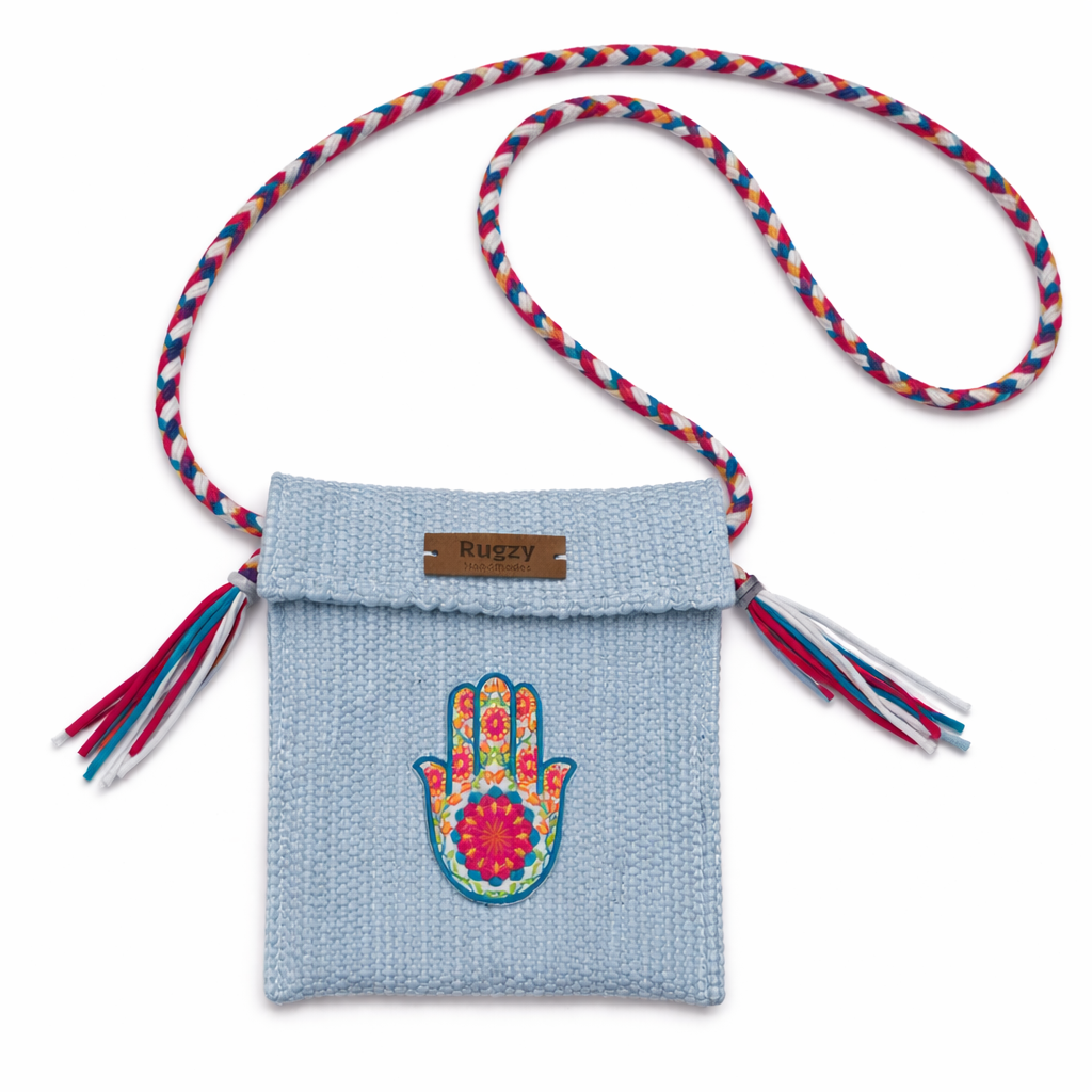 A handcrafted everyday essential in soft sky blue, featuring a vibrant multicolor Hamsa hand embroidery...